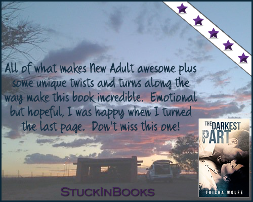 I have been a huge fan of Trisha Wolfe ever since she sent me her fantasy novella, Unveiled, for review I just fell head over heels in love with her writing style and her stories. When she told me she was trying her hand at a NA Contemporary I was beside myself with excitement. I adore contemporary novels and have been on quite a NA kick lately so I couldn't wait to dive into this one. Imagine just how much more excited I got when she said I could beta read it. I was bouncing in my seat I was so excited. The Darkest Part did not disappoint and is possibly the best novel that Trisha has ever written to date.