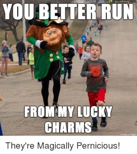 “Do me a favor,” she said to Rock. “Say ‘They’re always trying to steal me Lucky Charms.’”There's no shortage to Irish stereotypes in the book. The main character is a redhead! They all play fiddles! They get really rowdy, naked, and drunk. They dance on tabletops. They get drunk some more! They play more fiddles! Ye gods!