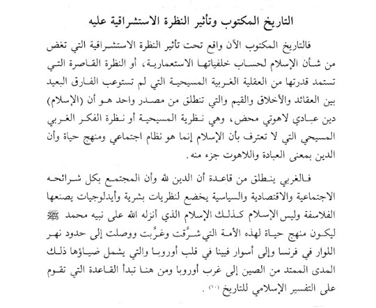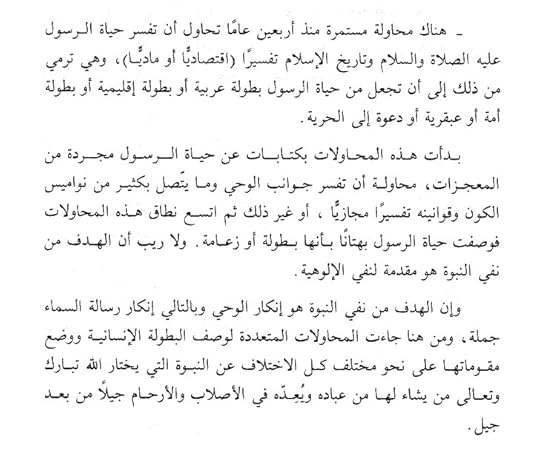 - عن المحاولات الحثيثة لجعل حياة الرسول عليه الصلاة والسلام وتاريخ الإسلام، مجرد بطولة عربية أو عبقرية أو دعوة للحرية أو ثورة ضد الفقر .. واتخاذ ذلك حيلةً للنفي الخفيّ للنبوة والوحي وشمولية الإسلام