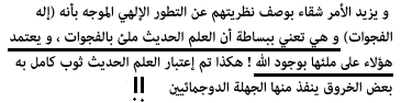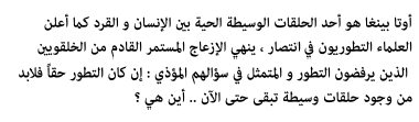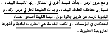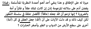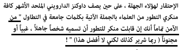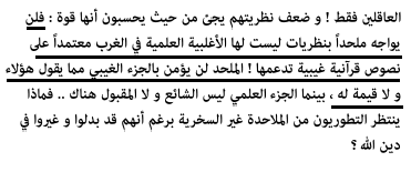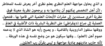 و يظل التطور نظرية راجحة عند العلماء لم يجزم احد بأنها لا يأتيها الباطل من بين يديها و لا من خلفها بل هم فيها باحثون يضيفون و ينقصون طبقا لأى متغير علمى كما فى اى نظرية اخرى. لو سلمنا بوجهة نظر الكاتب انها نظرية باطلة لوجود ثغرات بها و تعديلات لانهارت كل العلوم تبعا لهذا المنطق الذى تجاوزه العلم منذ زمن بعيد ففزياء نيوتن اليوم تنهار امام ميكانيكا الكم و نظريات ارسطو تنهار امام فيزياء نيوتن و ما عرفناه فى نصف قرن مضى يجب ثلاثة قرون قبله و ما عرفناه فى اربعة قرون سابقة لم تعرفه البشرية فى تاريخها الطويل القصير و كله بناء بعضه فوق بعض يكمل بعضه و ان تعارض او بدا مختلفا.