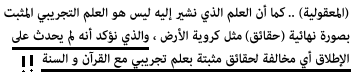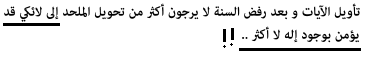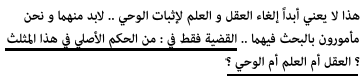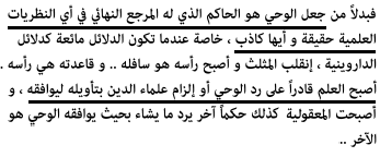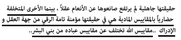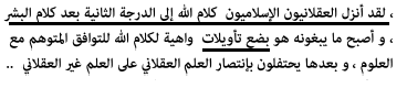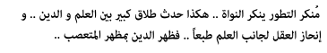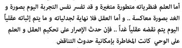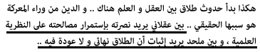بالأمس القريب كانت خطبة الجمعه عن حق الجار و فيها يقول النبى صلى الله عليه و سلم: يا ابا هريرة اذا طبخت اللحم فأكثر المرق و تعاهد جيرانك. فهل هى مجرد نصيحة من النبى نفهم منها الحث على التكافل و التعاضد و الألفة بين الجيران أم سنجد من يأولها بأن العلم الحديث سيكتشف فائدة تكثير المرق فى طبخ اللحم ثم يأتى احد الملحدين من بنى جلدتنا المتخفين فى صورة اعلاميين علمانيين و يستضيف الشيف الشربينى طالبا منه الرأى الفاصل بين العلم و الدين يا أمه ضحكت من سذاجتها الأمم.