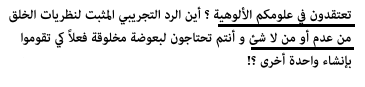 إرتدى العالم معطفه و تناول مشرطه و قطع رجلى الضفدع الاماميتين و قال له اقفز فقفز ثم قطع رجليه الخلفيتين و قال له اقفز فلم يقفز فكتب بدفتره:المقدمات الخاطئة تؤدى الى استنتاجات خاطئة.