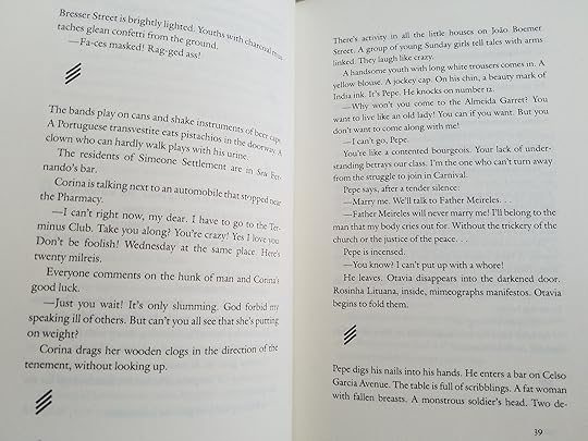 "From the bars she leans against, she sees the soldiers' mess. At nine, from the other direction, the luxury train to Rio goes by. The Southern Cross. Each compartment costs four hundred milreis for one night. She earned two hundred a month, sometimes less." - p 85