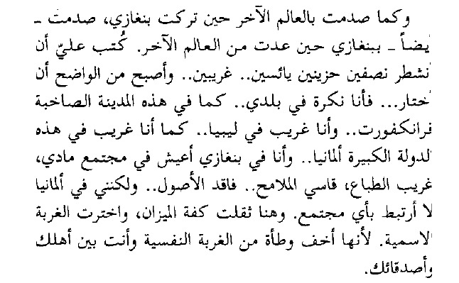 و هنا يحكي النيهوم عن غربته في اوروبا و غربته في بلاده ليبيا ايضا : _ ولكن .. هل انكر سعادتي بهذه الغربة ؟ كلا ,, انني في الواقع سعيد بغربتي لانها اقل ثأتيرا في نفسي من غربتي في بلدى , و ما اسوأ ان يحس الانسان بالغربة في بلده , لقد اصاب الناس الذهول و عبروا السنوات الماضية بقفزات شيطان اعمي .