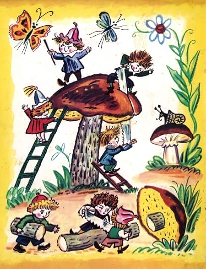 The first in a series of Russian picture-books setting out the adventures of Dunno (Незнайка in the original, meaning "don't know") to be published by Moscow-based Raduga Publishers - I am not entirely sure, but I think this entire multi-volume sequence may have been released as one volume initially, in 1954 - The Mites of Flower Town introduces the fairy-tale world that Nikolai Nosov would make the backdrop for his famous little hero's exploits. Tiny people who lived in a pretty little town on the banks of the Cucumber River, the Mites were divided into two kinds - the boy-Mites and the girl-Mites - who didn't always peacefully coexist. In this initial story, Dunno, so named because he knows, well... nothing, becomes convinced that a piece of the sun has broken off, and is heading for earth. His wild tale sets off a town-wide panic, until Doono - Dunno's opposite, who knows everything - sets everyone straight.