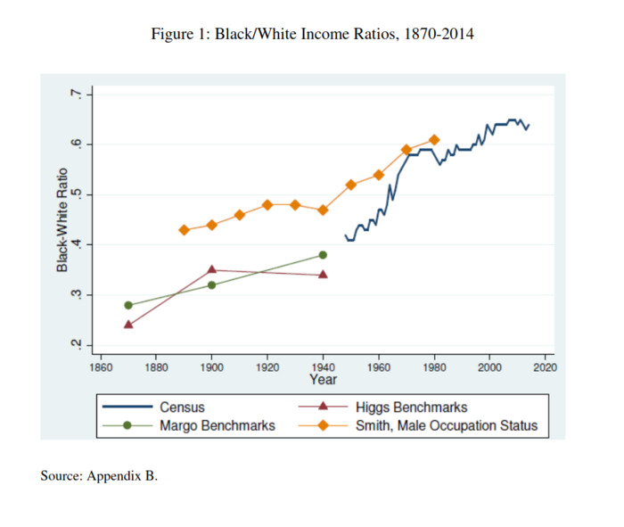 Houve significativa melhora relativa da educação da população negra no período, como comento nessa outra resenha. Mas essa melhora não se traduziu em melhorias nos indicadores econômicos. A possível razão para isso, como indicado pelos autores, é que capital humano apresentava um benefício limitado em uma economia essencialmente rural como o sul dos EUA.
