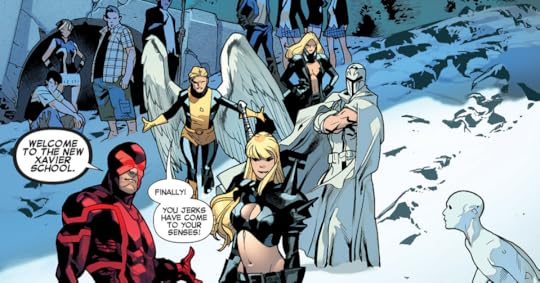 So, the kids have left the Jean Grey School, and now they (and Kitty Pryde) are running with Cyclops. As a bonus, they're back with Warren, so the gang's all together. I've honestly forgotten what happened in the previous volume, but apparently going back to their own time (at least for now) isn't possible. Yay!