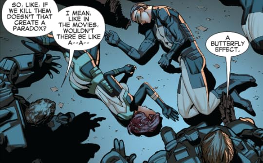 So I'm guessing that there was a damn crossover during those two issues, but none of that information is here. Not even in a summation. No "previously in All-New X-Men..." thing to catch us up. I have zero idea where to find those issues, or even if they're collected anywhere. With Marvel's numbering system of the past five or six years, who even knows what goes where? Not me. And I kinda don't want to do a bunch of research to find missing issues of comics that I'm only lukewarm about.