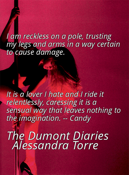 I am reckless on a pole, trusting my legs and arms in a way certain to cause damage. It is a lover I hate and I ride it relentlessly, caressing it in a sensual way that leaves nothing to the imagination. The beat moved through me and I got lost in its strength, pulsating against steel, spinning away only to return to it, my heels a blur of clear sparkle, my thoughts lost in the movement.