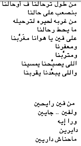 من طول ترحالنا ف أوحالنا بنصعب على حالنا من غربة لحيرة لترحيلة ما يحط رحالنا على فين يا هوانا مغربنا ومعفرنا ومتربنا اللي يصبحنا يمسينا واللي يبعدنا يقربنا