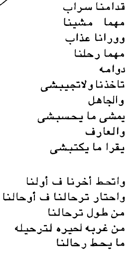 قدامنا سراب مهما مشينا وورانا عذاب مهما رحلنا دوامه تاخذنا ولا تجيبشي والجاهل يمشى ما يحسبشي والعارف يقرا ما يكتبشي
