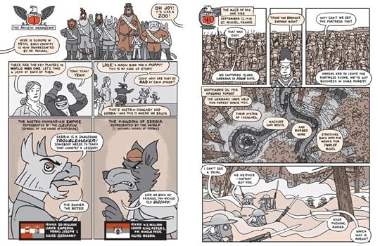 It's a daunting task to try and summarize all of WW1 as a middle grade graphic novel, but I think it was achieved pretty well. I think the Ares stuff was a bit too pretentious, IMO - you already have the frame narrative of telling this information to people from the revolutionary war + the animal metaphors for the nations, and I just think it's one layer too far. Characters in the book would even point out how out of place it felt.