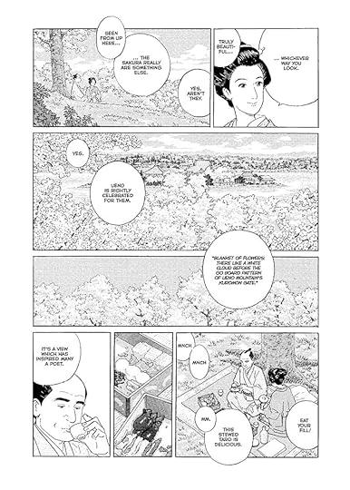 241019: this is very like The Walking Man by taniguchi but set in shogunate edo. not much plot, just images. wandering, experiencing, the simple life. each chapter focuses on single elements, not dramatically or more than gently symbolic. this is possibly how to view edo romantically and culturally as essence of japan, in beautiful line drawings, clear composition, still images, minimal dialogue. this is not japan currently known but as nostalgically rendered...