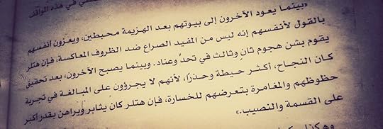 في الحقيقة الكتاب في مجمله رائع للغاية وكشف كثيراً من أسرار هتلر منذ طفولته وحتى ما بعد انتحاره.. كنت أظن أن كتاب كفاحي ماهو الا عن هتلر ولم اعلم أنه كان مذكراته التي كتبه اثناء سجنه اثر انقلاب فاشل قبل الحرب العالمية الثانية الذي استطيع قوله ان الكتاب حفزني على قراءة " كفاحي" والذي اقتبس الكاتب منه قليلا ليشرح طبيعة هتلر كذلك اشعر برغبة شديدة في اقتناء كتب عن الحربين العالمية الاولى والثانية وبالاضافة الى بعض الشخصيات الاخرى مثل موسليني وجوبلز استفدت كثيرا.. وكثيرا :)