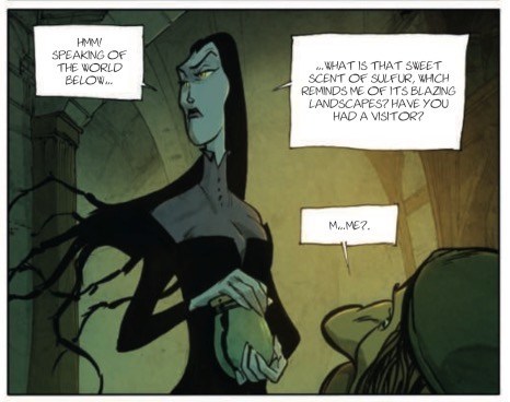 I don't know what it is about Dufaux, but he rarely creates characters that are truly engaging - or not for me, anyway. But Sortilèges does have a set of engaging characters. Of course they all belong to the realm of "En-Bas", or Hell. Miranda the witch looks like a cousin of Disney's Maleficent. She is deliciously vain, nasty and treacherous. She has a sidekick in the form of Horibili, a round little man who is too small to ride a donkey or a horse and therefor rides a goat. He escaped Hell to become a shopkeeper.