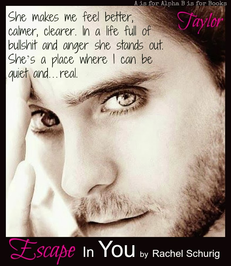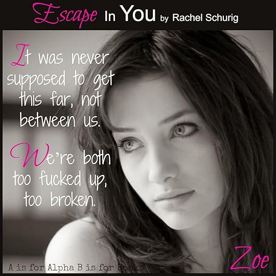 Escape in You is the first book by Rachel Schurig that I have had the pleasure of reading. It is an emotional new adult contemporary that deals with some darker themes. Escape in your is told in a dual narrative, split between Zoe and Taylor's point of views. Zoe and Taylor both have a lot to deal with on their plates, both at home and personally. After reading the book, I realized how similar the two of them were. It was eerily how similar they were. They were both closed off and dealing with sick mothers, even though the sicknesses stemmed from different things and manifested itself in different ways, the result was still the same. They each had to take on too much, too young. My favorite part of Escape in You was watching these Iron, bullet proof walls that Zoe and Taylor maintain around them at all times, come down. Escape in You is really about two people trying to find their way, and trying to see if they can find something safe and real in someone else. It ended up being a really sweet romance.