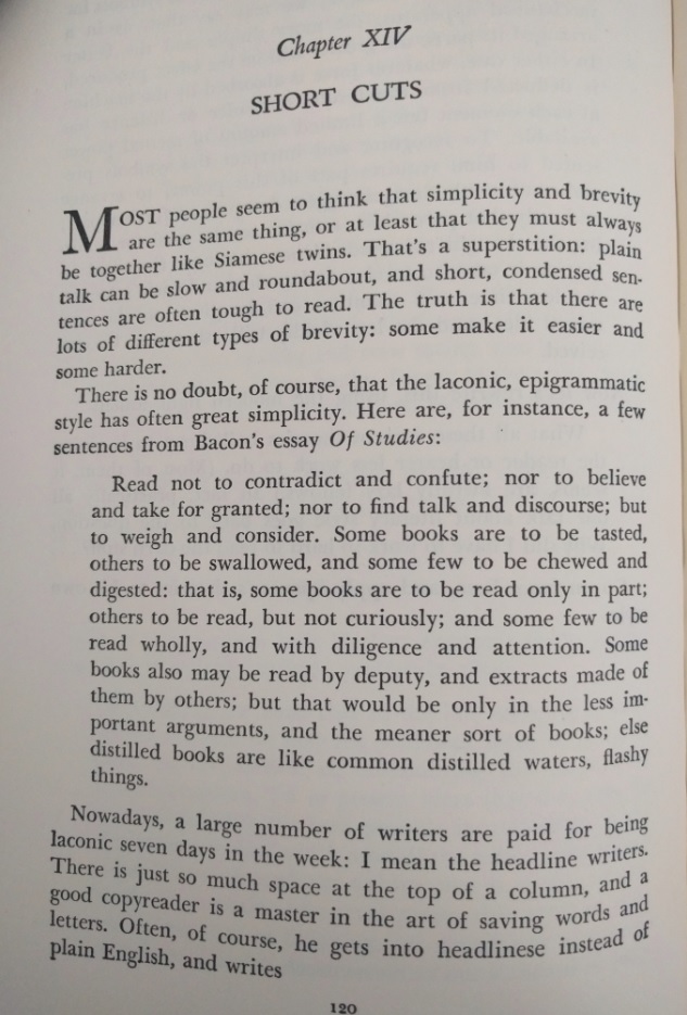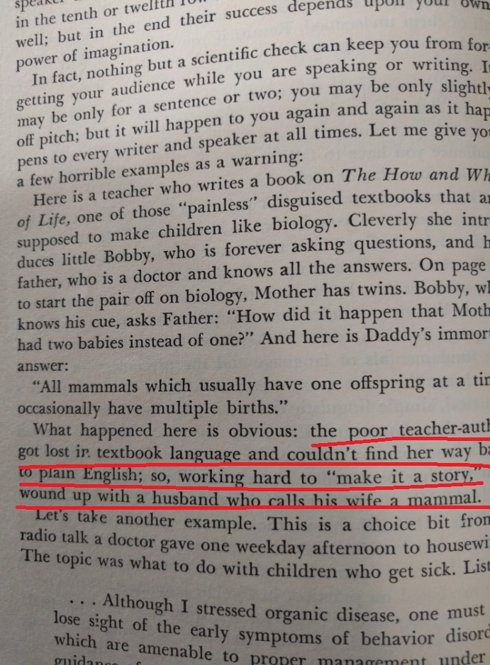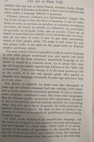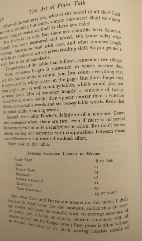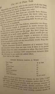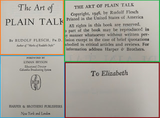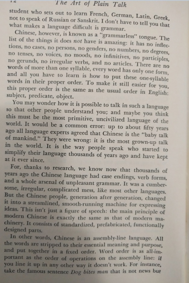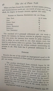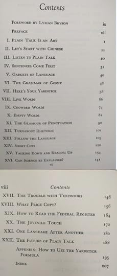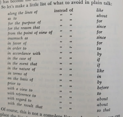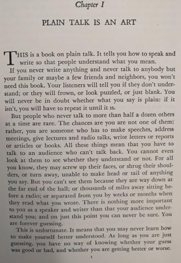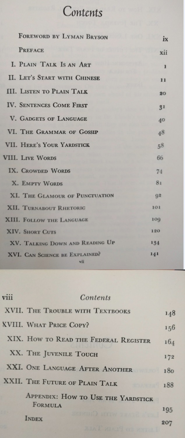 Reading this book is such a pleasure! It was written before twitter and even before computers existed. The author wrote a PhD dissertation on how to measure the clearness of the message when a person speaks, and his work was so successful that his teachers convinced him to create this book which is a beautiful jewel. This is the editorial information of the book Here is the table of contents. Each one of them is a mini-essay on what does it mean to speak clearly. Also, each chapter has exercises to try the suggestions of the author. I must confess that I tried two of the exercises, but ended up giving them up because they are extremely difficult. Not because I couldn't do them, but because it is difficult not to be very critical with your own work once you have seen the excellent things this master writes. Here is a list of common expressions that the author says we should avoid, also bookish expressions that will make a speech sound cocky . One I use a lot is "since", I am glad the convoluted form is "inasmuch as", because I have never employed such a rare expression, even when I was trying to seem intelligent :-) The author says that we live in a word where we have to write a lot. And this was back in 1946! Little did he know how often we write now, and how current is the need to be concise and clear (twitter anyone?). Here are the initial words of the book. This man was a master of expressing himself clearly. I don't know what to say except "read it for yourself". It is always a pleasure to enjoy such good pieces: The following page is interesting for two reasons: one is that the author clarifies that he does not want to teach you how to write, and the second reason is that he gives three very interesting examples of books that can help you with the writing endeavor: This book is full of funny anecdotes and many excerpts of great writing. Only because of that, to enjoy the amazing taste of the author it is worth to open it up. Here is one of those funny stories: a teacher that couldn't find her way to plain English, so she ends up creating a story where a husband calls his wife a mammal: And this is one of my definite takeaways from this wonderful book: a discussion about the Chinese language. I never knew that Chinese (spoken) is the easiest language in the planet. All words have only one syllable and one form (no tenses, no voices, no moods, no infinitives, no participles, no gerunds, no irregular verbs and no articles) Only the order and the tone count. It is fantastic! This book made me want to learn to speak Chinese. The following are several pages on the author's 'formulas' for plain talk. There are some mathematical terms and calculations on how many words or expressions of a particular class should be in a paragraph in order to classify it as 'plain'. This methodology is really interesting, and I understand that he developed a whole mini-industry around his model. He of course makes fun of lawyers and diplomats equally. Those are people that make a living on writing complicated paragraphs so people don't really understand what are they signing: There is one chapter that suggest a method to simplify the speech: imagining that you are speaking to a foreigner. This way you will use the least complicated terms of your vocabulary: Finally, in the Appendix, the author generously lays out all his secrets and shares the "magic" formula to speak clearly and plainly. He says that there is a magic number with which you can rate your speech and with it, you can try to improve your message: