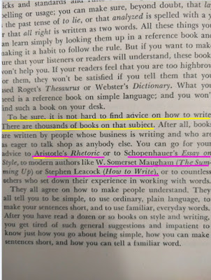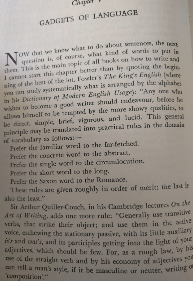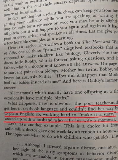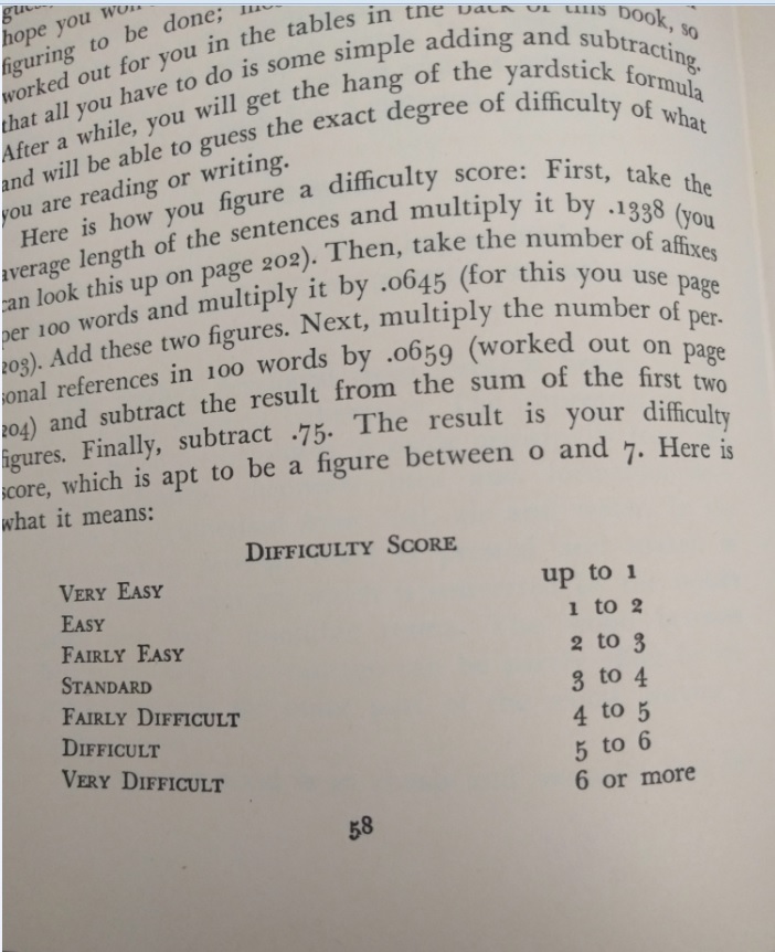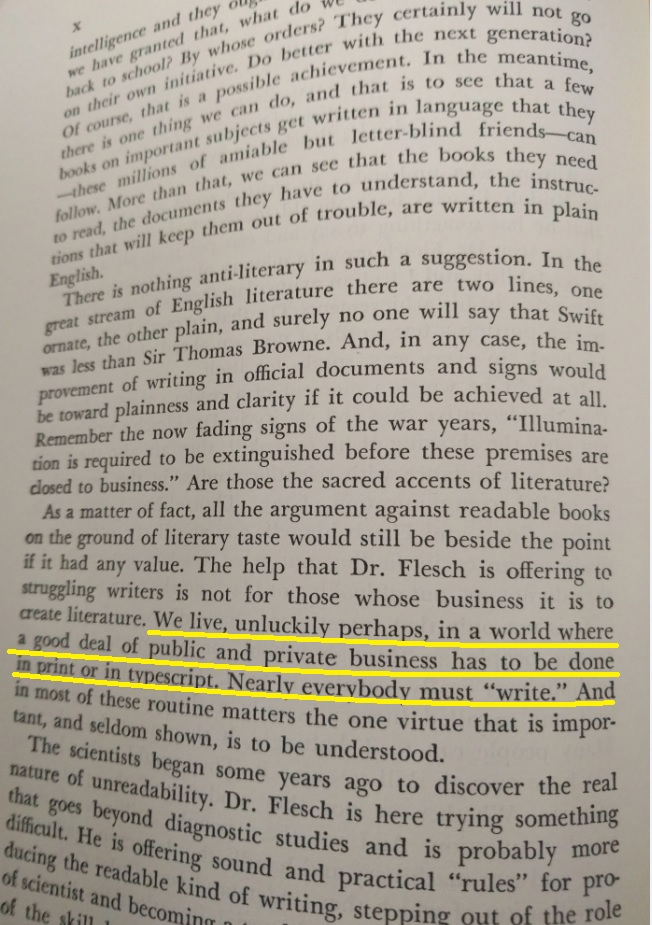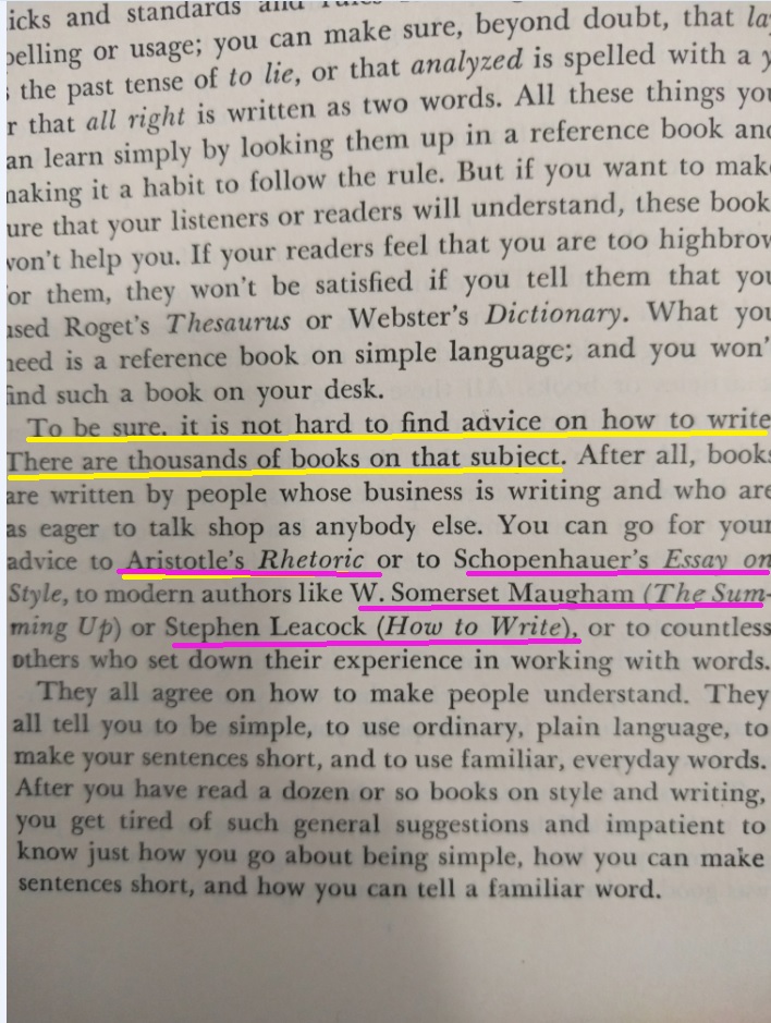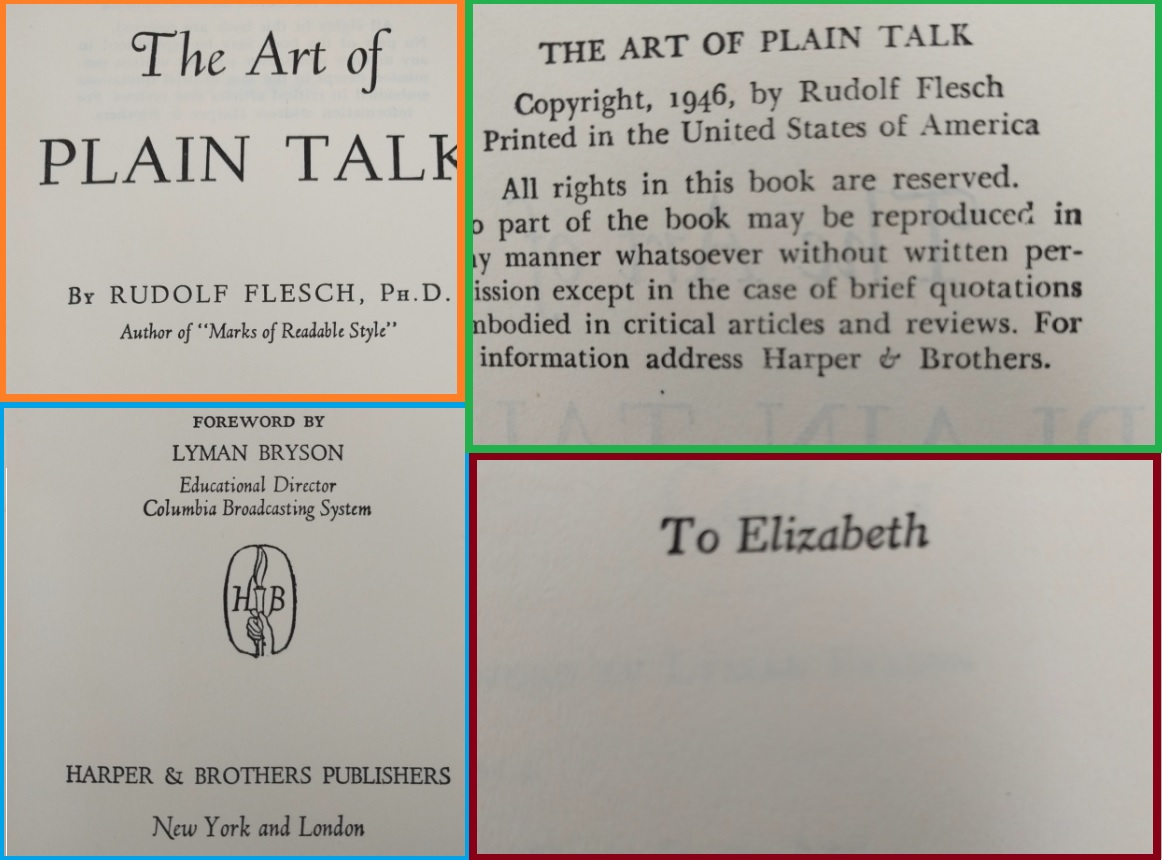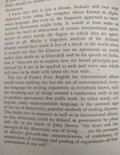 Reading this book is such a pleasure! It was written before twitter and even before computers existed. The author wrote a PhD dissertation on how to measure the clearness of the message when a person speaks, and his work was so successful that his teachers convinced him to create this book which is a beautiful jewel. This is the editorial information of the book Here is the table of contents. Each one of them is a mini-essay on what does it mean to speak clearly. Also, each chapter has exercises to try the suggestions of the author. I must confess that I tried two of the exercises, but ended up giving them up because they are extremely difficult. Not because I couldn't do them, but because it is difficult not to be very critical with your own work once you have seen the excellent things this master writes. Here is a list of common expressions that the author says we should avoid, also bookish expressions that will make a speech sound cocky . One I use a lot is "since", I am glad the convoluted form is "inasmuch as", because I have never employed such a rare expression, even when I was trying to seem intelligent :-) The author says that we live in a word where we have to write a lot. And this was back in 1946! Little did he know how often we write now, and how current is the need to be concise and clear (twitter anyone?). Here are the initial words of the book. This man was a master of expressing himself clearly. I don't know what to say except "read it for yourself". It is always a pleasure to enjoy such good pieces: The following page is interesting for two reasons: one is that the author clarifies that he does not want to teach you how to write, and the second reason is that he gives three very interesting examples of books that can help you with the writing endeavor: This book is full of funny anecdotes and many excerpts of great writing. Only because of that, to enjoy the amazing taste of the author it is worth to open it up. Here is one of those funny stories: a teacher that couldn't find her way to plain English, so she ends up creating a story where a husband calls his wife a mammal: And this is one of my definite takeaways from this wonderful book: a discussion about the Chinese language. I never knew that Chinese (spoken) is the easiest language in the planet. All words have only one syllable and one form (no tenses, no voices, no moods, no infinitives, no participles, no gerunds, no irregular verbs and no articles) Only the order and the tone count. It is fantastic! This book made me want to learn to speak Chinese. The following are several pages on the author's 'formulas' for plain talk. There are some mathematical terms and calculations on how many words or expressions of a particular class should be in a paragraph in order to classify it as 'plain'. This methodology is really interesting, and I understand that he developed a whole mini-industry around his model. He of course makes fun of lawyers and diplomats equally. Those are people that make a living on writing complicated paragraphs so people don't really understand what are they signing: There is one chapter that suggest a method to simplify the speech: imagining that you are speaking to a foreigner. This way you will use the least complicated terms of your vocabulary: Finally, in the Appendix, the author generously lays out all his secrets and shares the "magic" formula to speak clearly and plainly. He says that there is a magic number with which you can rate your speech and with it, you can try to improve your message: