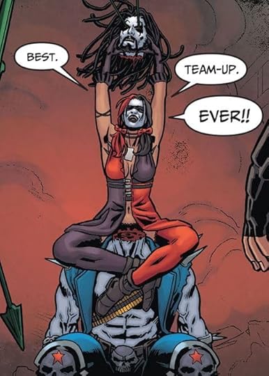 There's a lot of great things here. Lex and Superman being all chummy, even if I'm slightly confused as to why they would be. Maybe because Lex is the only survivor of Metropolis? In at least one version of Lex's origin story, he and Clark used to be good friends, so maybe it's that. It's an interesting dynamic to see them working together. There's a lot of really good action, and some important and carefully handled deaths. And my favorite thing ever: Harley Quinn psychoanalyzing Lobo into submission. Brilliant.