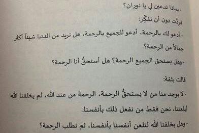 أخطأ نور إلا أني أحببته أيضًا، مسكين نور، عانى من والده صغيرًا، كبر بالألم وعاش به، ولم يكفِ الحياة فأهدته الشعور بالذنب لتقضي على ما بقى فيه من قوة.. تمنيت لو أستطيع أن أضمه، أن أربت على قلبه وأقول له "جميل أنت يا نور جميل رغم ما ارتكبت، رُبَّما أخطأت ولكن جمعينا نخطئ، الله رحيم يا نور، ألم تخبرك نوران أنه لا يوجد مِنَّا من لا يستحقُّ الرحمة، أن الله لم يخلقنا ليلعننا "