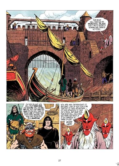 These are great, classic sword and sorcery comics. Thorgal always reminds me of an 80s Fantasy movie and he is probably an inspiration for them (the comics were first published in the 70s). There's the strong, smart barbarian (he's a bit of a Conan type) who is forever having to save his lady, Aaricia (who happens to be pregnant in this volume). There's a shifty goblin-like character, enscorcelled towns-people, a mysterious castle, and a series of puzzles that Thorgal must battle his way through. The villians are clearly evil and a bit mustache-twisting. The hero is strong and polite and clever and bows to no one. Of course, Thorgal isn't out seeking fame and fortune. He was just hoping to settle down with his wife and raise a family, but that's not going to happen.