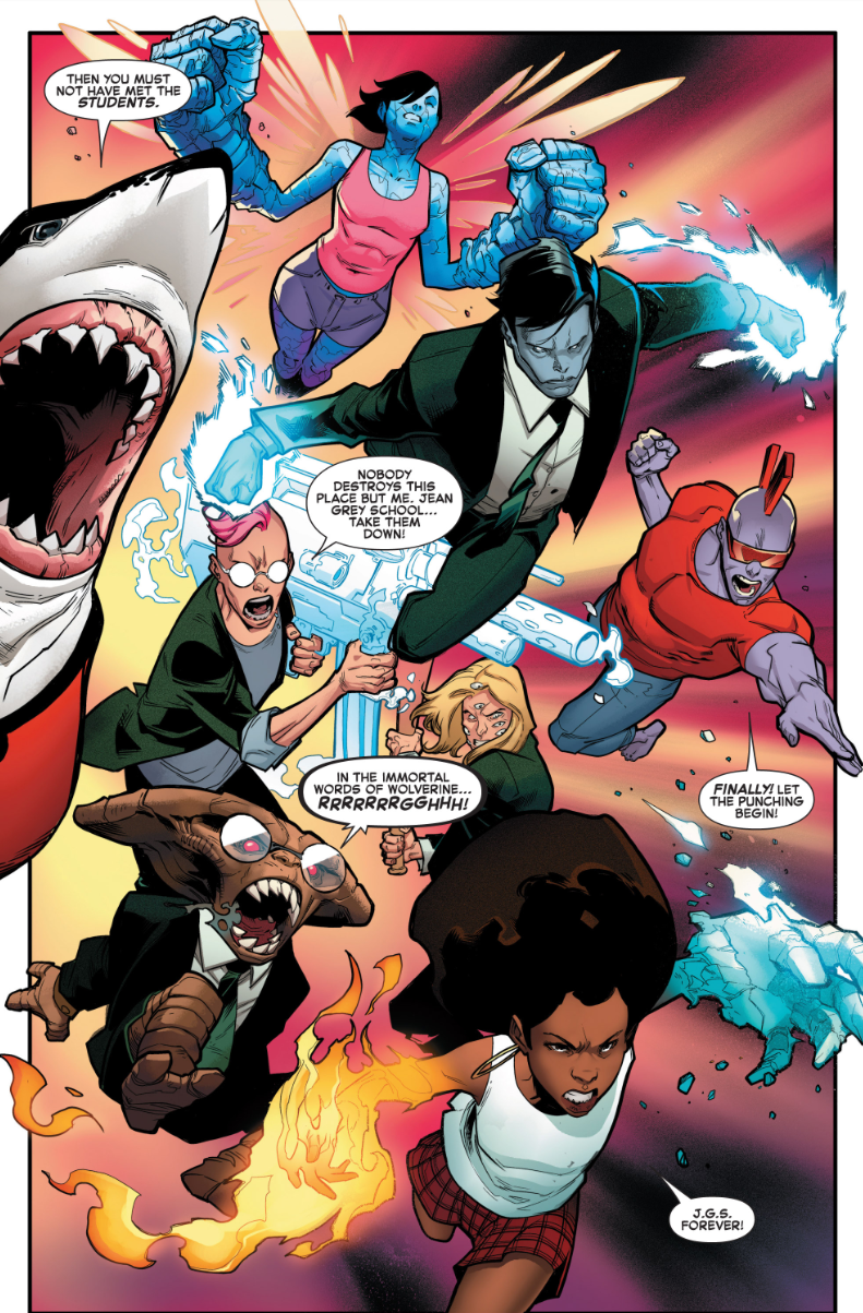 When it gets to the meat of the volume, though, the run in with SHIELD and then graduation, it hits a home run. The story is set up in a way that gives enough action to keep you satisfied while also really zeroing in on those characters we like so much. Logan and Scott run into each other to break out of some of their monotonous grumbling finally, though not entirely. It was a nice closure to where they were with the Schism at the beginning of this series. Then graduation was just a blast. It's a great way to close out this volume of the title.