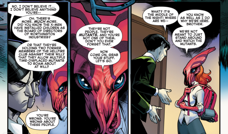 Still, the big picture hasn't really changed, and Aaron kicks off the volume with two parallel storylines. In one, a brother-and-sister mutant pair arrives at the school to learn how to control their powers...only to be revealed as spies assigned to keep tabs on the school. The brother grows to love the weird institution Aaron has created, though, and agrees for the pair to be mind-wiped and expelled so as not to put it in jeopardy.