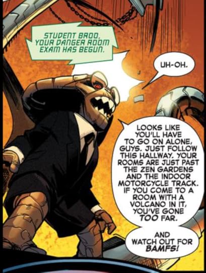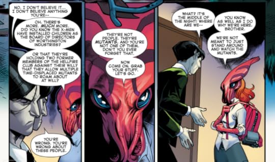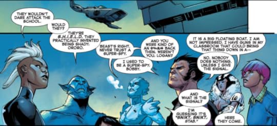 Frustratingly, the series picks up in the aftermath of an X-men crossover, "Battle of the Atom" that jumbles the cast Aaron has been working with. Several of the X-faculty have headed over to Cyclops' rival mutant operation, and it's a little confusing at first if you haven't read the crossover in question.