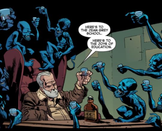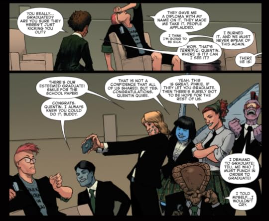 And there are so, so many individual things to love in this volume. Yes, there's fun and jokes and glorious homework, but I think it's the serious moments that will really stick with me. Captain America standing with Quire at graduation. Toad's exit from the book. (And who ever thought that I'd be moved by Toad?) There's the single best and most insightfully written conversation between Wolverine and Cyclops that I've read since AvX, at least. And there's a future scene with a somewhat elderly Logan that's sweet without getting soppy.