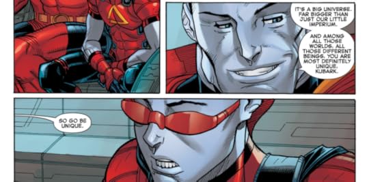 Szkoda mi było wątku Toada. Reakcja Kroaki bezcenna. Naprawdę, jestem ciekaw jak to się dalej potoczy, aczkolwiek całe to zamieszanie z szpiegami od SHIELD było słabe. Podobnie zresztą jak annual, gdzie przyszło nam obserwować co robił Kid Gladiator, gdy jego ojciec zabrał go z powrotem na akademię Shi'ar.