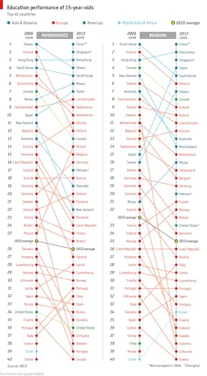 i read this book as part of research for an article i'm currently writing. my overall instinct was that this book was more prancing (yet also meandering and narcolepsy-inducing, at several points) storybook than critical analysis of the world's "best" education systems. this premise of ripley's was based off their performances in PISA; which, as many others have pointed out, is a slightly questionable one.