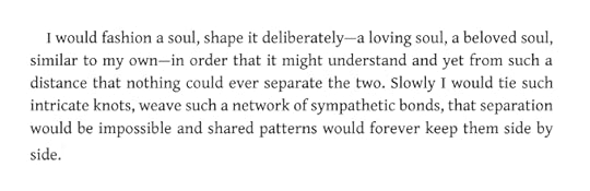 " I would fashion a soul, shape it deliberately—a loving soul, a beloved soul, similar to my own—in order that it might understand and yet from such a distance that nothing could ever separate the two. Slowly I would tie such intricate knots, weave such a network of sympathetic bonds, that separation would be impossible and shared patterns would forever keep them side by side. "