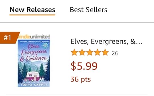 "Elves, Evergreens, & Evidence" by Tonya Kappes is book 34 in the "Camper and Criminals Cozy Mystery" series. Mae and the Laundry Club ladies try to figure out who killed not only 1 but 2 people. Mae knows how to get people to talk and puts her sleuthing to work. She goes undercover to get closer to someone who has put a protective order against her and gets herself in a pickle. I enjoy reading Tonya's books and always look forward to the next one. The Camper series is one of my favorite series by Tonya.