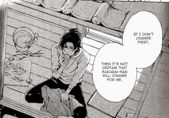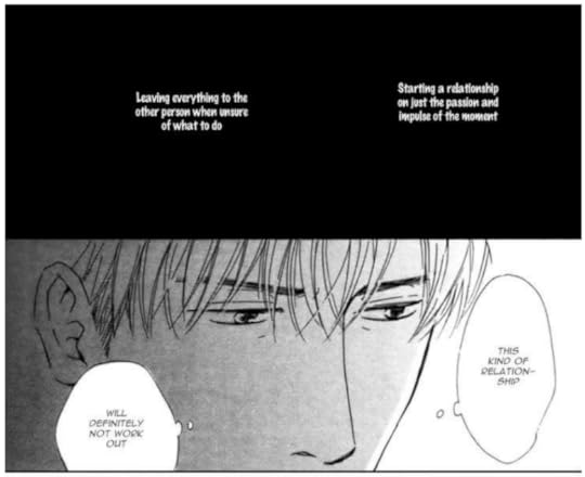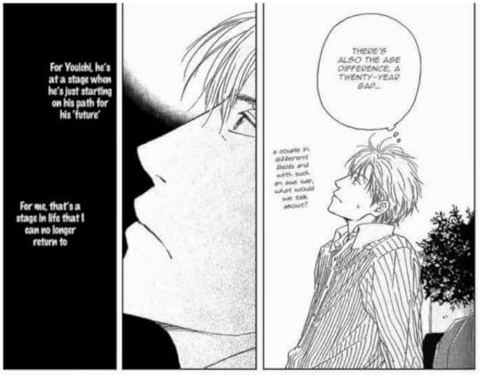 There's a huge age gap, which I never like. The older guy, Sakurai, who I'm going to say is the MC as we never really get into Youichi's head at all, has only ever dated women and takes forever to recognize his own attraction, so there's a bit of a GFY vibe.