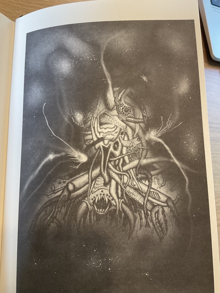 I backed away, unashamedly babbling, screaming Crow's name repeatedly as the — Thing — came after me. It was octopoid, this dweller in the earth. . . flowing tentacles and a pulpy gray-black, elongated sack of a body. . . rubbery. . . exuding a vilely stinking whitish slime. . . eyeless. . . headless, too. . . Indeed, I could see no distinguishing features at all other than the reaching, groping tentacles. Or was there — yes! — a lump in the upper body of the thing. . . a container of sorts for the brain, or ganglia, or whichever diseased organ governed this horror's loathsome life!