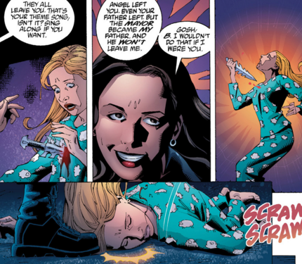 Haunted by Jane Espenson: We all knew this one was going to rock. Jane has a history with writing for Buffy and she brought her knowledge to the table and then some. Okay, so the school has just burned down. But the Mayor isn't gone for good just yet. He runs around possessing the dead bodies of animals, people and vampires alike, all to get a shot at Buffy, and to stick around for Faith. Faith is in the hospital from her numerous injuries, and it's still uncertain if she's going to wake up. But that doesn't mean she gets left out of all the action. Buffy starts having dreams about Faith, where Faith is seriously kicking ass and killing Buffy at every turn. Let's not forget all of the talk of upcoming college experiences, and Xander still being conflicted about what the hell he actually plans on doing. Oh, and did I mention that this is actually the first mention we get of The Initiative and thus, ADAM! Sadly, no Riley Finn in this one, but he comes along later, looking as dreamy as ever in all his pencilized glory.