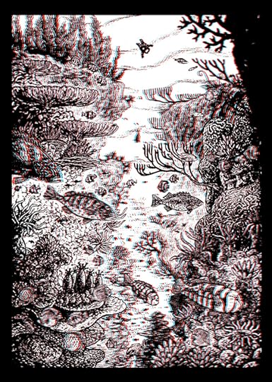 Statt Taucherhelm und Atemgerät benötigen Lesende nichts weiter als die beiliegenden 3D- Brillen, um in eine faszinierende Unterwasserwelt abzutauchen.