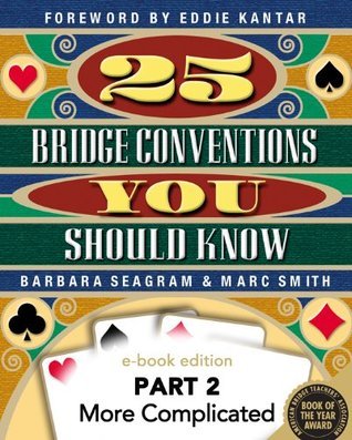 Based on the best-selling book 25 Bridge Conventions You Should Know, "part 2: More Complicated" includes the following 9: Jacoby 2NT forcing major raise Chapter 10: Splinter bids Chapter 11: Cuebid raises Chapter 12: Balancing Chapter 13: Help suit game tries Chapter 14: Control-showing cuebids Chapter 15: Grand slam force Chapter 16: Michaels cuebids and Unusual NT Chapter 17: Landy 2♣ over opponents’ 1NT For the remaining conventions, look for these Bridge Conventions You Should Know - Part 1: Learn These First25 Bridge Conventions You Should Know - Part 3: Sophisticated Stuff