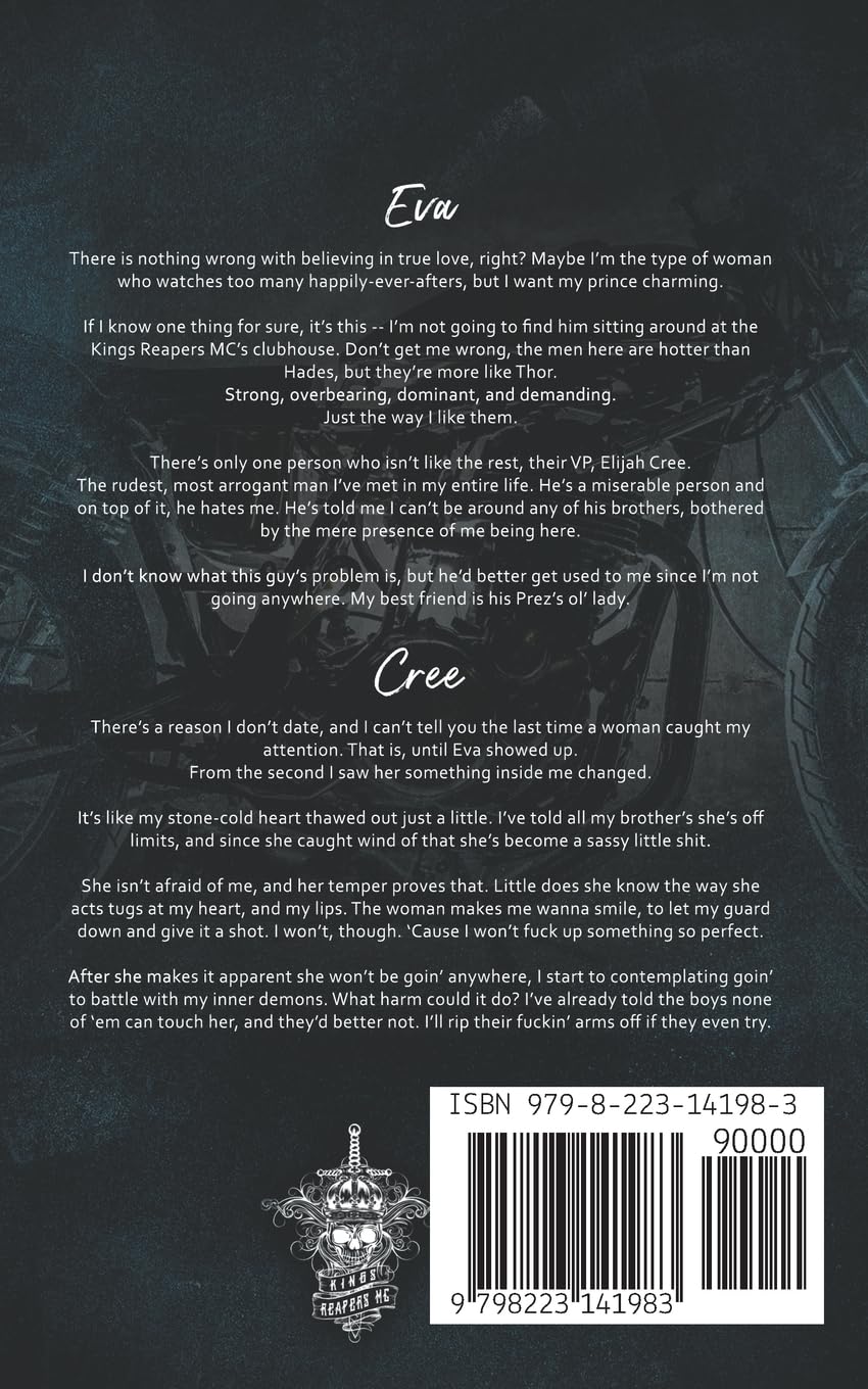 I head down to the kitchen, and I gasp when I see that Cree is practically hunched over Becky, one of the club whores. She’s giggling as Cree holds her arms above her head, his mouth level to her ear. I didn’t think my heart could hurt any worse, but seeing him like this slays me. He glances at me, and for a second, I see guilt, but it’s quickly replaced by a stony glare. “Can I help you?” he snaps.