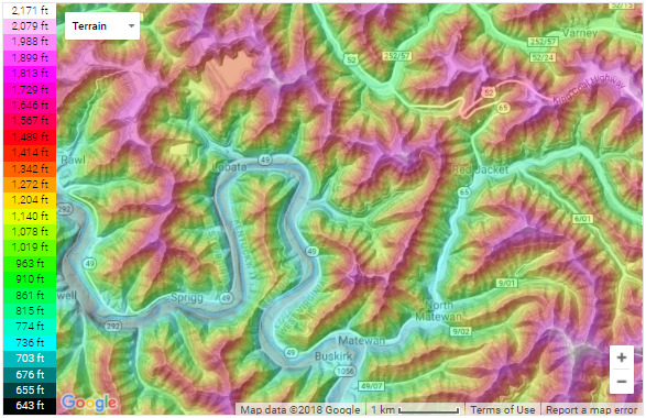 I mentioned before that this was both familiar and frustrating to me. Well, it was familiar because of all that above - my having lived in the area and traveled through some of the same areas mentioned in the book. (Wise, Virginia was specifically mentioned, and that was where the McDonalds was!) But it was frustrating because I didn't feel like the book did the area justice regarding how beautiful it is, and how secluded and isolated it would have been, especially how difficult it would have been to get around there. In the book everyone's just hopping around like they are teleporting from place to place, and it's only when outsiders, reporters or detectives, come that there's any semblance of distance or difficulty in getting around, and most of that is shown in the reluctance of the Hatfield clan to let strangers near them. But 20 or 40 or more miles through this kind of mountainous, forested terrain while on foot, or even horseback, would take a while. It's not just "Oh, we're gonna pop next door to Kentucky for some flour, BRB" kind of travel time. I mean, look at the variance on this topographical map. It ranges from 2000+ feet down to around 700ish feet.