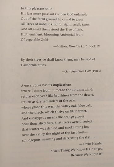 At the same time, he wants to suggest that there were alternative ways for Californians, over the last hundred and fifty years, to integrate trees into their state, and their state into modernity--which were not followed. In particular, he looks to a nineteenth-century tendency to obscure the division between urban and rural, as well as between ornamental and fruiting trees. But he only makes a few references to this road-not-taken--xxxvii and 363, for example--otherwise concentrating on the road that was followed.