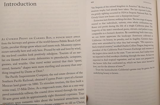 "Extinction lasts forever; nothing else does. The tree rings of sequoias remind us that individuals, nations, even whole civilizations may flower and perish during the life of a single California plant. The longevity of the state's introduced gums, citruses, and palms is more comparable to a human's duration. By considering both time scales, we can better appreciate the landscape Americans cultivated in California--its beauty, its penalty, and its fragility." (p. 438)
