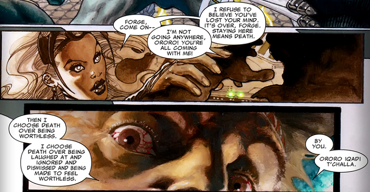 Now let's go back to Forge. Apparently, the asshole has once again lost it, most especially after M-Day occurred. I mean, the guy is already hanging by the thin line and now it has gotten so worse. How worse? Well, he operated on mutants and transformed them into his own version of Triploids. And now he planned on using a Ghost Box to travel to those other dimensions and attack them. Because in Forge's demented, decaying mind, that solves everything. And, of course, since this is an alien invasion, it's the territory of S.W.O.R.D., much to Scott's chagrin. Agent Brand stepped in in the nick of time and fired a concentration of lasers to destroy the parallel dimensions on the other side as soon as the Ghost Box went online, so to speak. But before that, we get this harrowing conversation between Forge and Ororo who already have a complicated history God, let's not bring up The X-Tinction Agenda. It's sad and I feel a little bit bad for Forge here