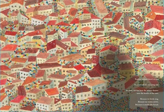 One spread of a red-roofed town with a giant's shadow over a part of it. "You can tell it's not a big city/because you can hear the movie theater/over the bustle of the cars./Because its birds sing./Because no trains arrive./Because it smells like bread."