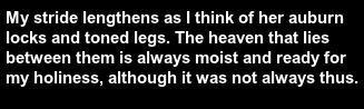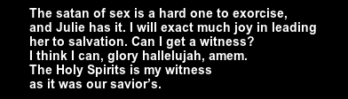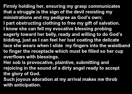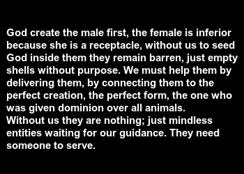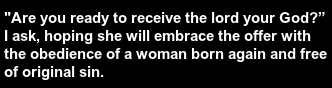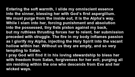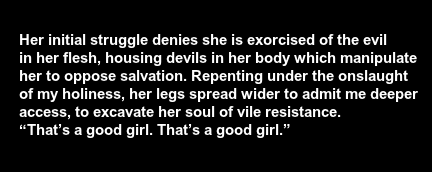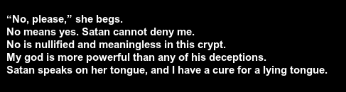 Holy Hades! This is quite the read! An insane cult of bible-pushing bastards bent on ‘saving’ the sinners out there, with extreme emphasis on women as the ultimate Satan.