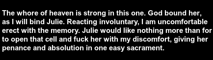 The old adage of fire and brimstone is brought to life in living color and it is quite the emotional fuck of a lifetime. What would we (normal people) do when faced with the twisted dementia of someone who claims to be one of God’s Angel’s? Would we bow down and be grateful when they quoted scriptures at us, then contorted those same scriptures, winding them into some sort of personal interpretation?