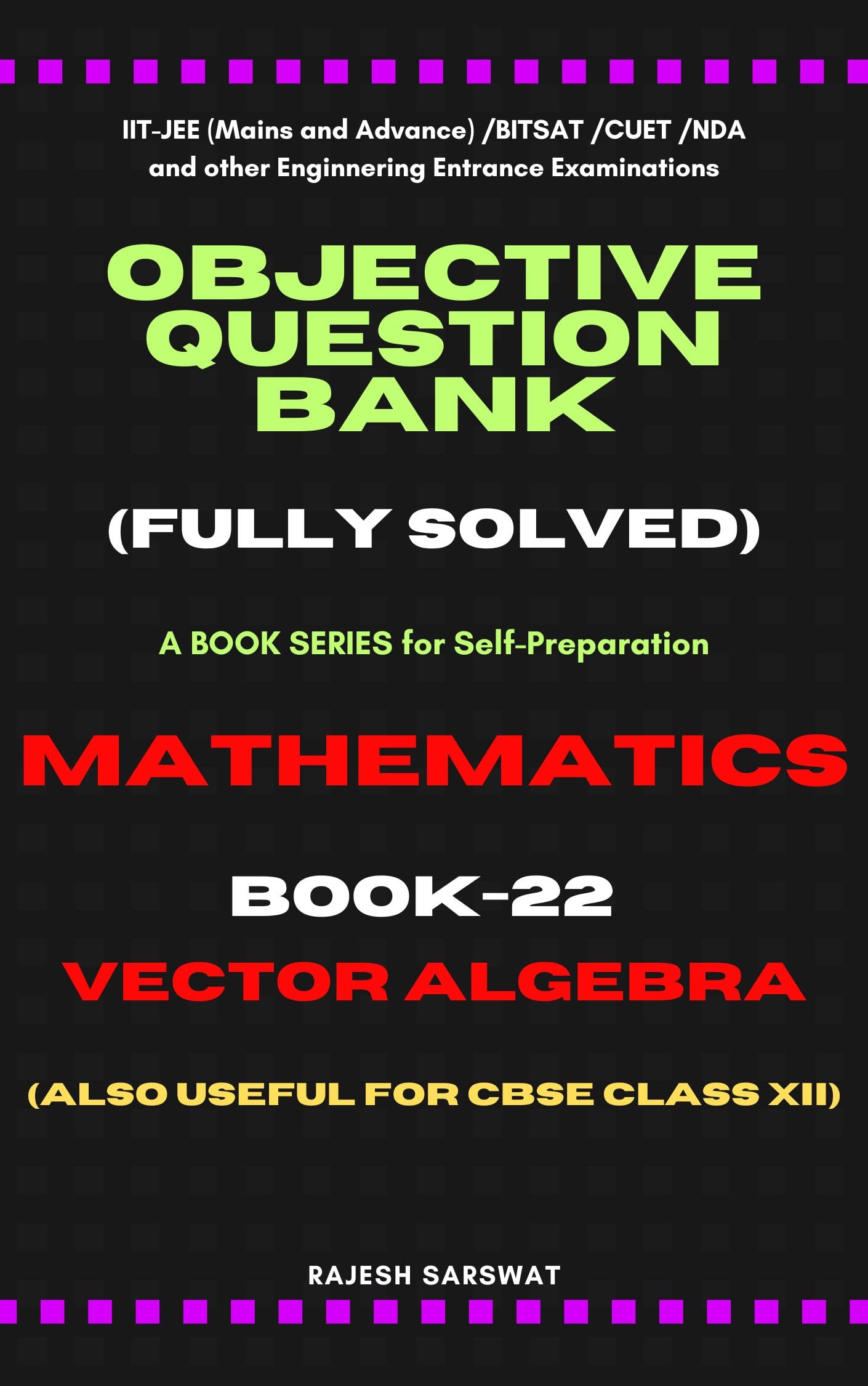 "Objective Question Bank Mathematics-Book-22-Vector Algebra" is the 22th book of an exceptional book series tailored to cater to the subject of Mathematics in the realm of IIT entrance examinations. However, its relevance extends beyond IIT-JEE aspirants, as it serves as a valuable resource for CBSE Class XI and XII students, NDA exam takers, BITSAT Exam candidates, and individuals preparing for various engineering entrance examinations. The core objective of the book is to help the students in their self-preparation without any external help.