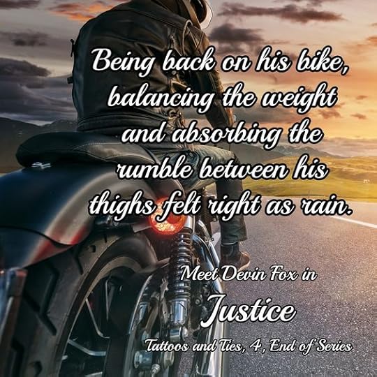 Justice, the last book in the Tattoo and Ties series picks up right where Chaos, book three left off and Dev and Cash are still in deep trying to figure out where the stolen money has gone and who is on who’s side because there are a few unexpected surprises that I definitely didn’t see coming and I bet you won’t either. I just loved these two characters together. When they say opposites attract they were not kidding. Dev(Devilman), sexy biker has chaos written all over him and definitely keeps the strait laced Cashin James on his toes, but within all the crazy going on around them they found peace and happiness with one another and most of their actions were all in order to protect the other one and those they love.