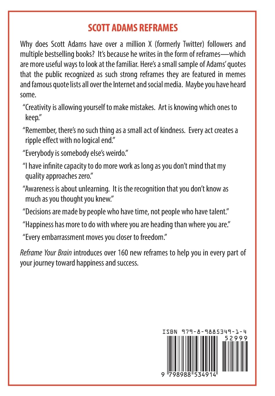 In Reframe Your Brain , Scott Adams, the contrarian genius behind Dilbert and author of the most influential personal success book of all time- How to Fail at Almost Everything and Still Win Big -gives you the complete operating system for lasting happiness. Are you familiar with this old saying? "All publicity is good publicity." That's a classic reframe. The quote shifts your thinking from the shame of whatever you did wrong to your probable benefit. You can't change the past, but you can change how you feel about it. Trained hypnotist and persuasion expert Scott Adams has packed more than 160 new, counterintuitive, and effective reframes into Reframe Your Brain. For Usual Manage your time. Manage your energy. Usual Success depends on who you know. Success depends on how many people you know. Usual Your critics are evil monsters. Your critics are your mascots. Usual The universe is acting against you. The universe owes you. These instant perspective-shifters will help you feel better on demand and succeed at any endeavor without the usual pain or pitfalls. The reframe collection covers personal fulfillment, business and career success, mental health, social activities, and physical well-being. If only 10 percent of the reframes work for you, your life will never be the same. Prepare to embark on a journey of transformation as Scott Adams shares his most invaluable insights and practical techniques to date, empowering you to reprogram your own reality using words alone.
