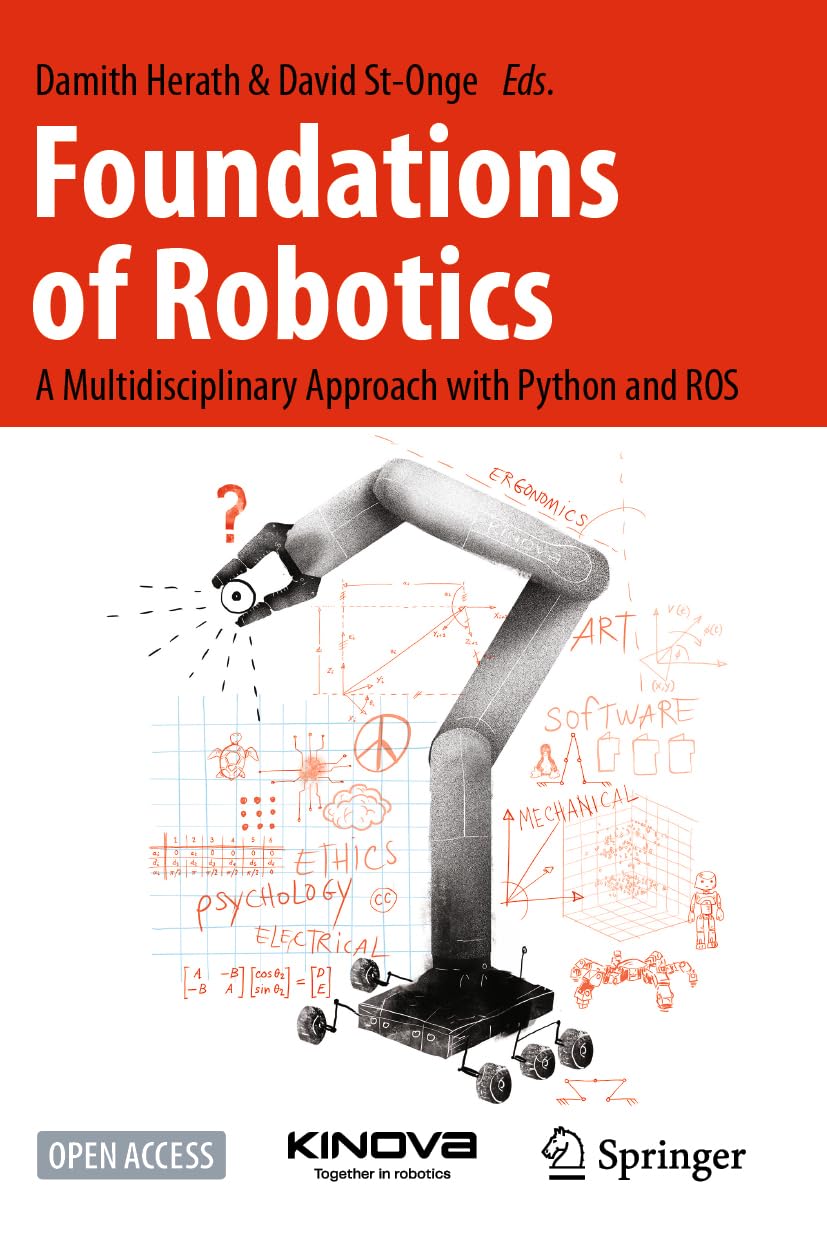 This open access book introduces key concepts in robotics in an easy to understand language using an engaging project-based approach. It covers contemporary topics in robotics, providing an accessible entry point to fundamentals in all the major domains. A section is dedicated to introducing programming concepts using Python, which has become a language of choice in robotics and AI. The book also introduces the reader to the Robot Operating System (ROS), the ubiquitous software and algorithmic framework used by researchers and the industry. The book provides an inspired, up-to-date and multidisciplinary introduction to robotics in its many forms, including emerging topics related to robotics on Machine Learning, ethics, Human-Robot Interaction, and Design Thinking. The book also includes interviews with industry experts, providing an additional layer of insight into the world of robotics. The book is made open access through the generous support from Kinova Robotics. The book is suitable as an undergraduate textbook in a relevant engineering course. It is also suitable for students in art and design, high school students, and self-learners who would like to explore foundational concepts in robotics. “ This book provides the ‘foundation’ for understanding how robots work. It is the accessible introduction that artists and engineers have been waiting for .” - Ken Goldberg, William S. Floyd Jr. Distinguished Chair in Engineering, UC Berkeley.